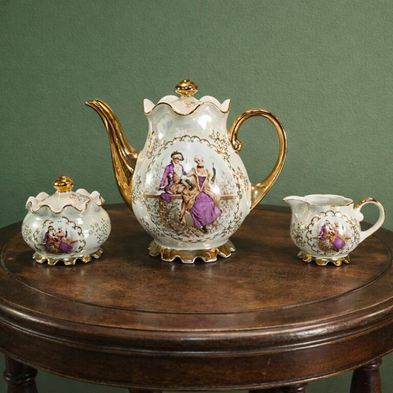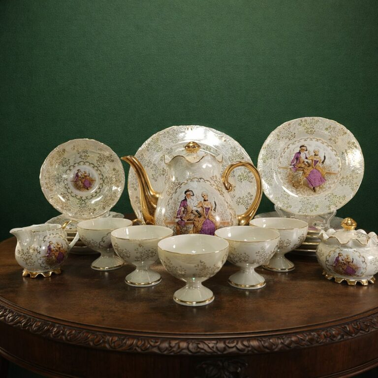 Сервиз кофейный, декорированный галантной сценой и растительным декором (19 предметов), фарфор, люстр, золочение, деколь, Япония, 1980-2000 гг.