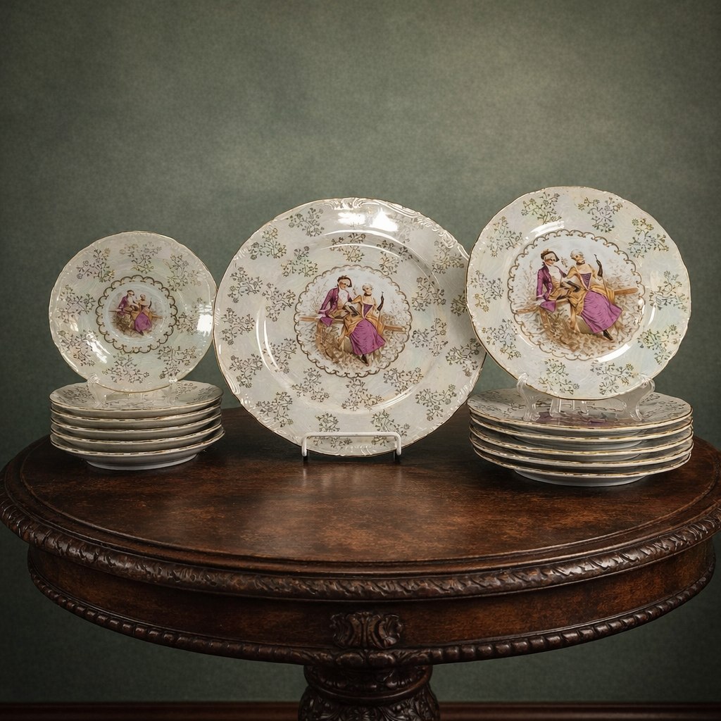 Сервиз кофейный, декорированный галантной сценой и растительным декором (19 предметов), фарфор, люстр, золочение, деколь, Япония, 1980-2000 гг.